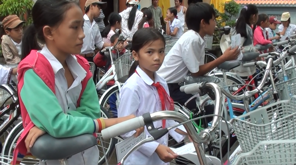 Chúng tôi đến Quảng Trị trong một ngày mưa to gió lớn vì cơn bão đang tràn vào tỉnh Quảng Trị. Nơi đây anh Cộng tác viên Lê Văn Diêu đã mời các em học sinh mồ côi và nghèo khổ đến nhận 21 chiếc xe đạp. Các em trong độ tuổi từ 12 đến 15. Nhìn các em nhỏ bé xắn cao quần trong tấm áo mưa mỏng như bong bóng, các em háo hức xếp hàng chờ đến phiên mình nhận xe. Mắt các em sáng rỡ lên và vui mừng khi được gọi tên đến nhận xe. Các em cùng nhau đạp xe ra khỏi cổng chùa để về nhà thấy thương lắm. Chúng tôi cùng cười lớn vui mừng vì đã được thay mặt các ân nhân với tấm lòng rộng mở của HTBQTA để đem đến cho các em một chút niềm vui.
