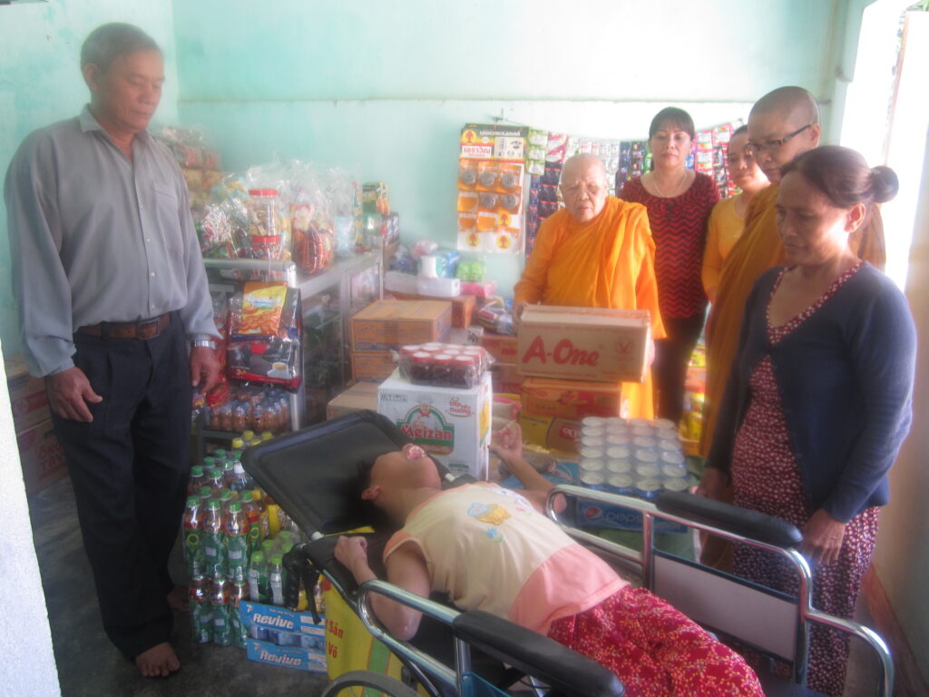 Through the winding streets of Quảng Ngãi, we visited a family that receives help from HOC. From outside the house’s gate, I heard screams. Coming into the yard, I noticed a sign on the modest house announcing it was a donation from an organization in the city.