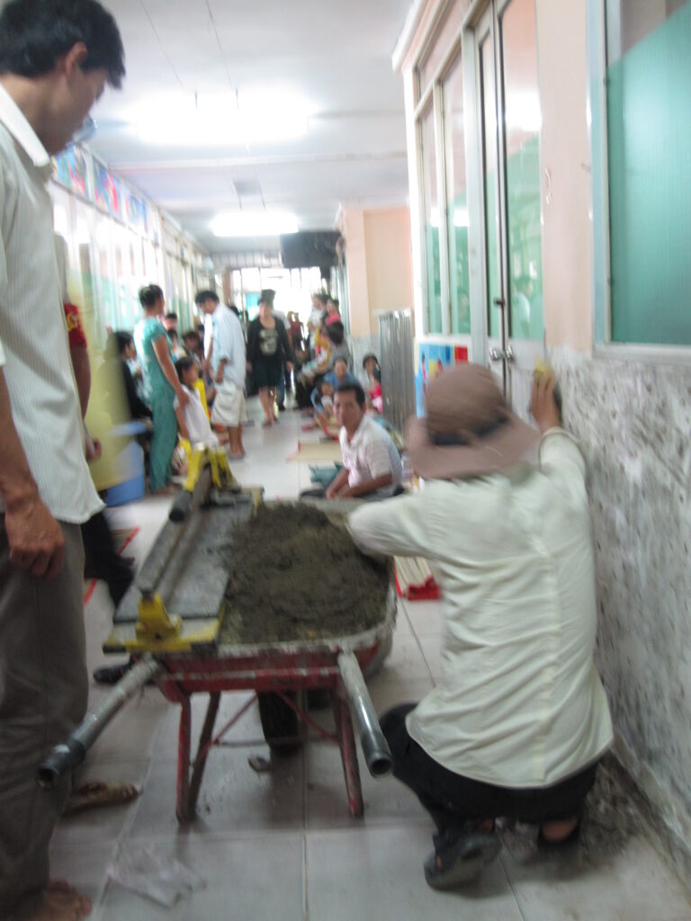 The halls and rooms overflowed with patients and caretakers. Along the walls, children laid upon thin straw mats while their parents sat next to them. One child had a saline line attached. His father stood beside him holding the pouch. Metal beds were arranged in every room to maximize space. A thin straw mat covered each bed. The patient laid upon the bed, along with his/her caretaker and all their belongings. On the floor under each bed laid another patient and his/her caretaker. If fortunate enough to be assigned a room, families with their sick children claimed any open space on the floor. Each new sight I witnessed made me appreciate the medical care I receive in the US. Despite its shortcomings, the health care system in the US is many times more advanced and “friendly.” Hospitals are required to treat all emergencies first, then deal with billing after. The reverse occurs in Vietnam and other developing countries. Even on the brink of death, if a patient’s family cannot pay the hospital fee, the patient will not receive medical care.